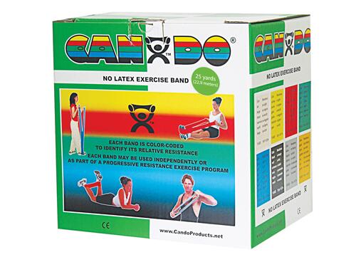 $43.38CanDo© Latex Free Exercise Band – 25 yard roll – Green – medium: CanDo© resistive band exerciser roll is packaged in a dispenser box *Simply unroll desired length of exercise band from dispenser box and cut with scissors *CanDo© high quality synthetic latex free exercise band has been used for physical therapy and athletic training by clinics fitness centers and individuals since 1987 *It has become a well known staple of many physical therapy programs *The latex free formula has been specially created to mimic the stretch characteristics of latex band *CanDo© exercise band is an economic solution for upper and lower body exercise *Lightweight compact and portable *Durable. Effective when used alone or with handles and anchors *Color-coded according to the exercise band?s resistance *CanDo© is licensed to use the Thera-Band© color sequence so resistance level is easily identified *Available in 8 levels of resistance for progressive exercise *Levels range in order of strength from least to greatest resistance: tan yellow red green blue black silver gold *Uniform width – each band is 5 wide *Dimensions: 7 x 6 x 7 *Weight: 3.0 lbs *UPC: 714905043221